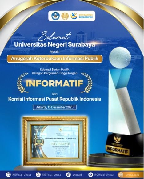 Unesa.ac.id, SURABAYA—Universitas Negeri Surabaya (Unesa) kembali meraih predikat informatif dengan skor penilaian 94,01 dalam Anugerah Keterbukaan Informasi Publik 2025 yang diselenggarakan Komisi Informasi Pusat Republik Indonesia ...