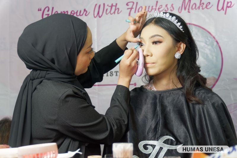 Unesa.ac.id, SURABAYA—Mahasiswa prodi S-1 Pendidikan Tata Rias, Fakultas Teknik (FT) Universitas Negeri Surabaya (UNESA) mengadakan kelas kecantikan yang diikuti sebanyak 46 peserta baik sebagai perias maupun model di Mall Royal Plaza pada Minggu (14/5/2023).