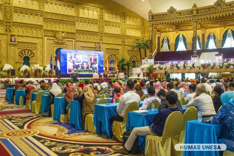“Ke Surabaya melintas Jembatan Merah, lewat Tunjungan jangan lupa soto babat, UNESA telah menjadi PTNBH, UKT tetap merakyat dan bersahabat. Jalan-jalan ke Kenjeran yang indah, jangan lupa makan duren, setelah menjadi PTNBH, UNESA semakin keren,” pantun Prof Nizam mengakhiri penyampaian materi.