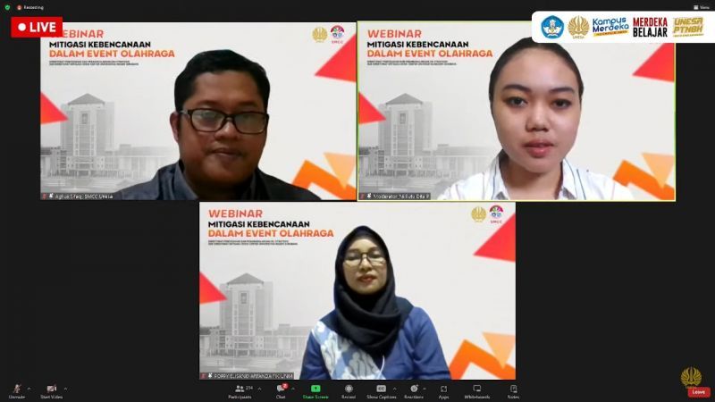 Unesa.ac.id., SURABAYA—Subdirektorat Mitigasi Crisis Center (SMCC), Direktorat Pencegahan dan Penanggulangan Isu Strategis Kampus, Universitas Negeri Surabaya (UNESA) menyelenggarakan webinar Mitigasi Kebencanaan dalam Event Olahraga pada Kamis, (5/10/2023).