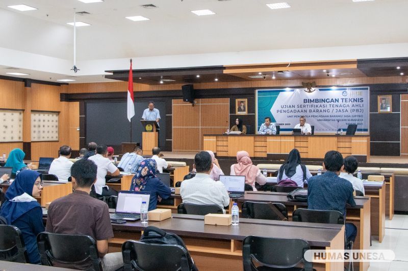 Salah satu langkah konkrit UNESA lewat Unit Pengelolaan Pengadaan Barang/Jasa (UPPBJ) yaitu menyelenggarakan Rangkaian Bimtek dan Ujian Sertifikasi Kompetensi Pengadaan Barang/Jasa yang bekerja sama dengan Lembaga Pengembangan dan Konsultasi Nasional (LPKN).