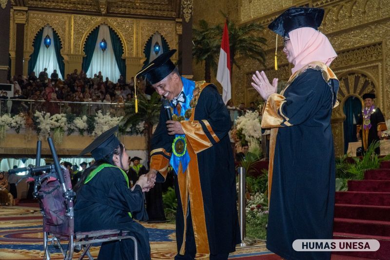 Sementara itu, Kirana Meilana Dwi Nada merasa terharu bisa merayakan hari wisudanya itu. Terlebih mendapat apresiasi dari pimpinan UNESA atas perjuangannya selama ini. Dia menceritakan, selama kuliah dia mengaku didampingi pendamping dan relawan sehingga memudahkan dalam melakukan mobilitas.